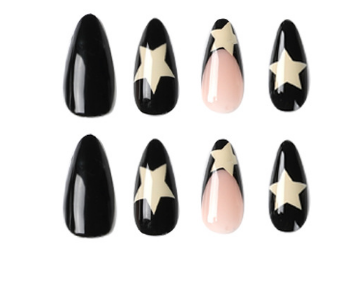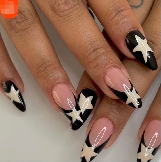Black Star Designs: The black star designs add a distinctive and eye-catching element to the nails. Stars are a popular and versatile motif in fashion and beauty.